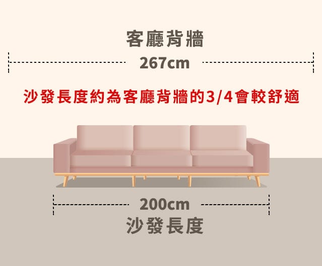 沙發的長度為左邊扶手至右邊扶手的總長,沙發長度基本上會跟著尺寸大小而不同,例如單人沙發 > 雙人沙發 > 三人沙發,長度就是越來越長,沙發的比例可以抓客廳背牆的 3/4,例如客廳背牆約 266 公分,266 * 3/4 = 200 公分,沙發就可以挑選 200 公分的尺寸。